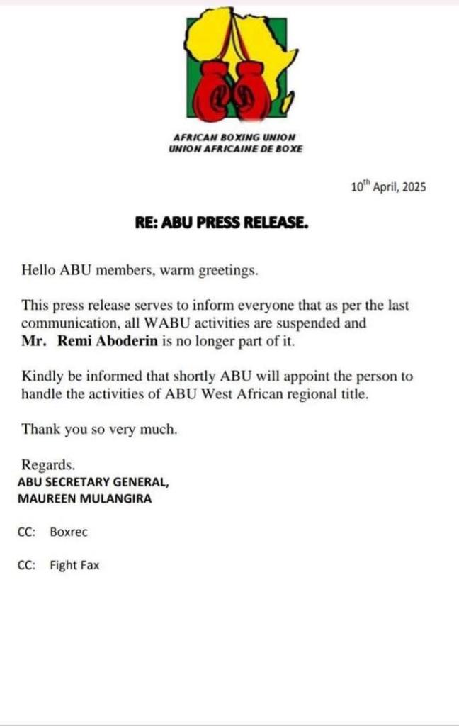 This press release serves to inform everyone that as per the last communication, all WABU activities are suspended and Mr. Remi Aboderin is no longer part of it.