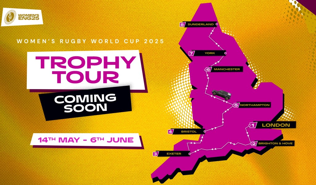 - Women’s Rugby World Cup trophy will embark on three-week tour of England across May and June, connecting with fans and local communities in all eight RWC 2025 host locations.
