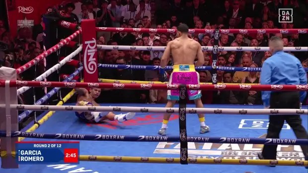 Everything changed in the second round when Romero realises he can open Ryan up. 2:46minutes into the second round, Rolly with a double left hock right to the chin followed by a straight hook floored Ryan Garcia and the supporters could not stop screaming.